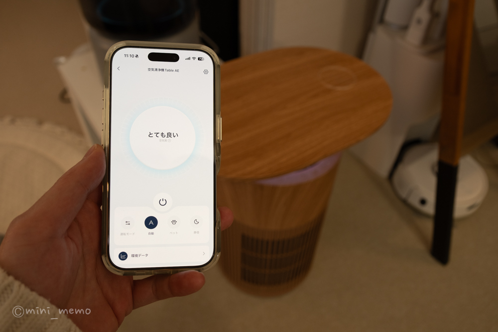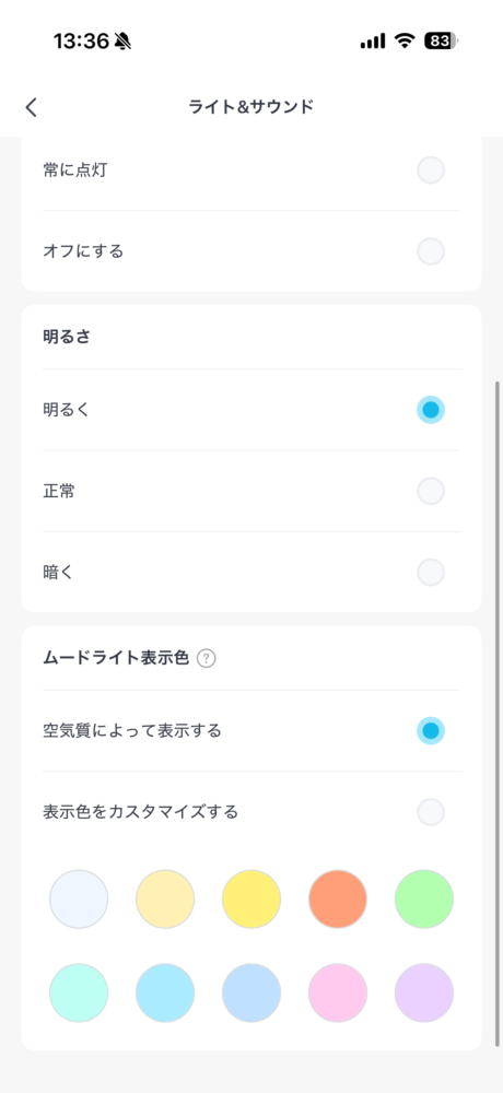 アプリを開かなくても、部屋に入った瞬間に光の色で空気の状態がわかるのは、地味ですが非常に便利な機能です。