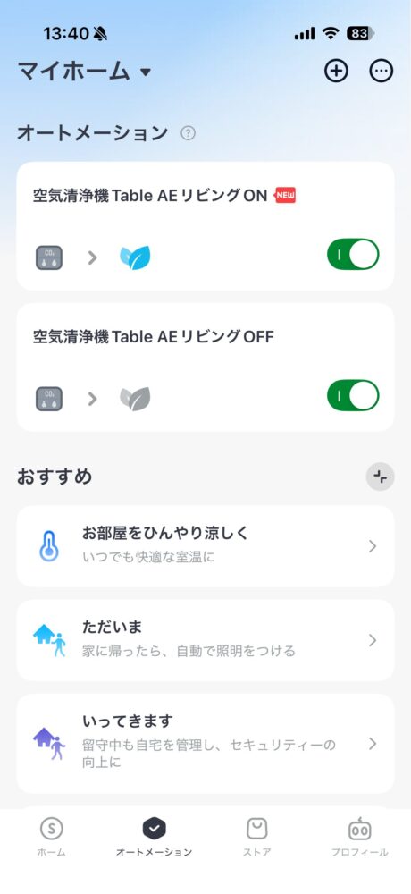 - 人感連動:SwitchBotの人感センサーが人を感知したら、空気清浄機Tableを自動でオンにする。