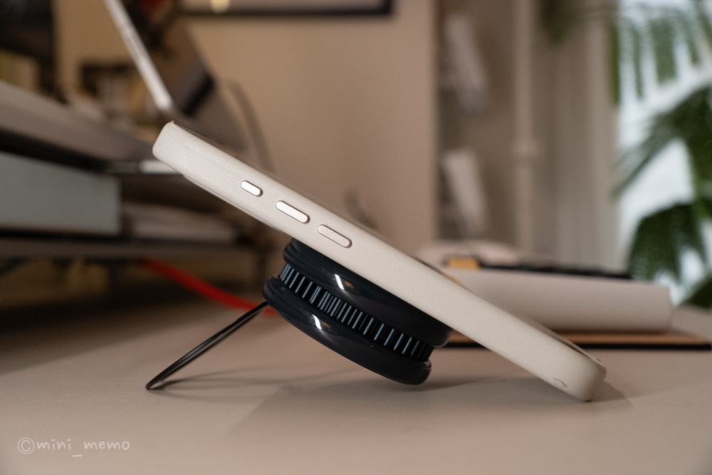 デスク上で常に最適な角度に調整できるため、作業中や休憩中にiPhoneを「ちょい置き」する際の利便性が格段に向上します。また、MagSafeの強力な磁力のおかげで、スタンドとして使用中にスマホがズレ落ちる心配もありません。